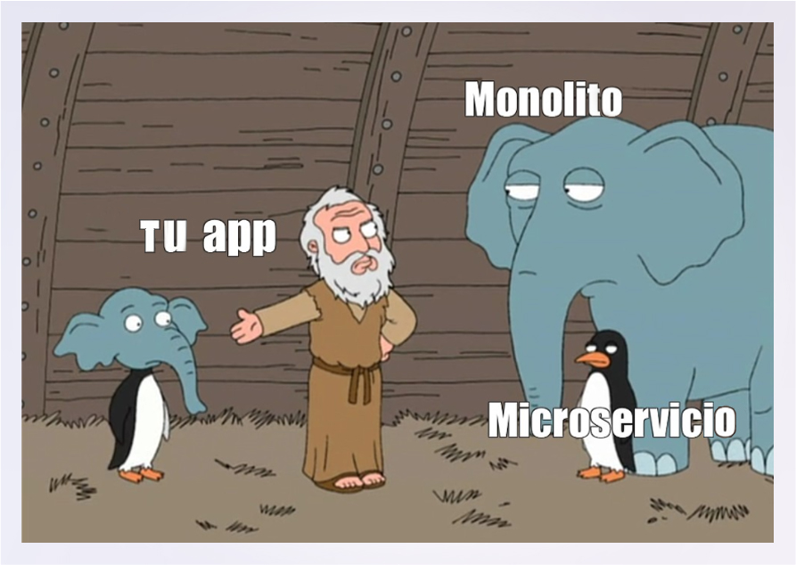 La transversalidad de ese cambio cultural en los equipos exige responsabilidad y compromiso con las prácticas. Echar mano a entornos de APis como Spring Boot o NodeJS para trabajar con microservicios no garantiza que las lógicas centralizadoras, al estilo de los monolitos, desaparezcan. Quizás un meme te ayude.